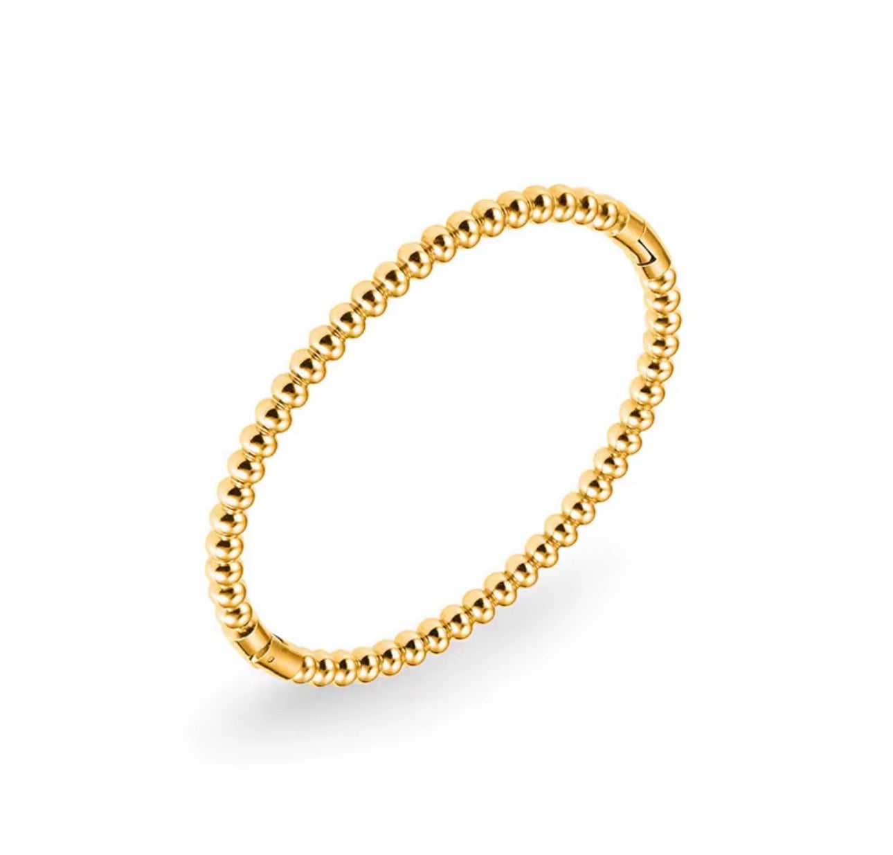 The Aura Bangle a timeless bangle crafted from perfectly polished gold beads, forming a seamless circle of soft shine and elegance. The rounded silhouette creates a fluid, minimalist look that feels both modern and classic.