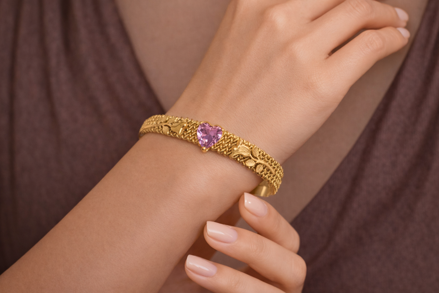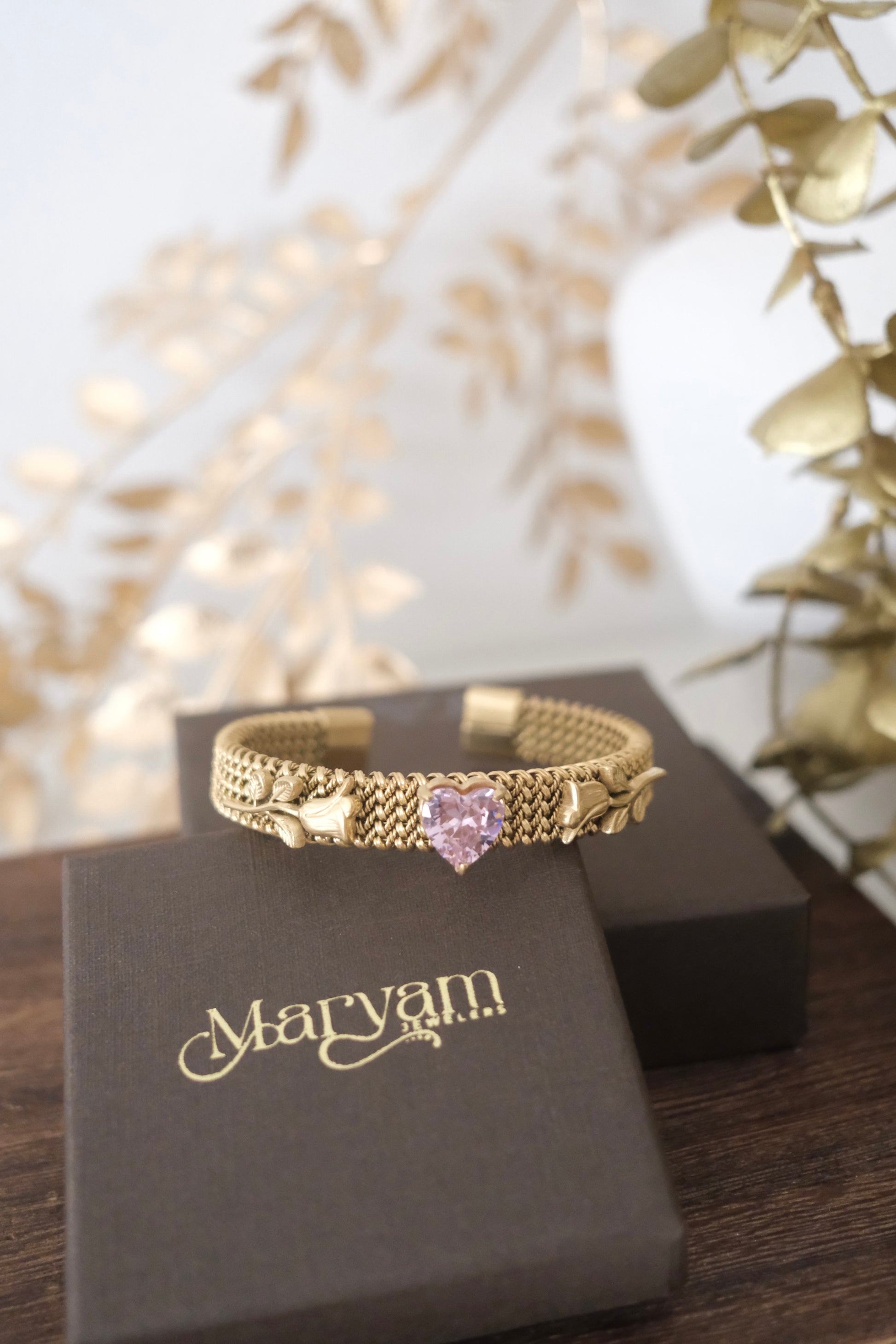 The Aurelia Heart Cuff is a romantic statement infused with artisanal detail, the Aurelia Heart Cuff features an intricately woven gold-tone band crowned with a soft blush, heart-cut stone at its center. Delicate leaf motifs flow along each side, symbolizing growth, love, and natural elegance. The textured weave adds depth and character, while the open cuff design offers a comfortable, adjustable fit.