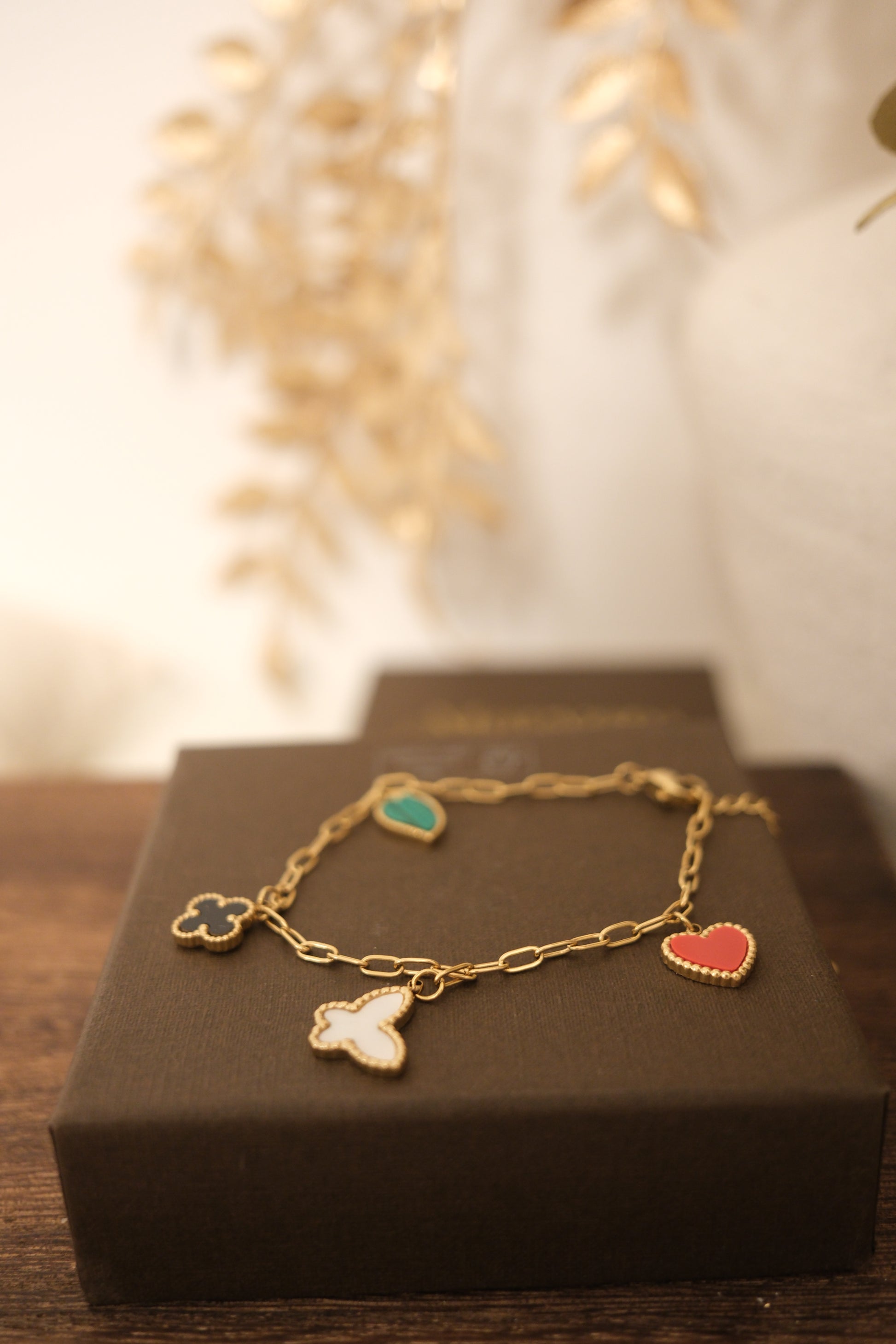 The Charme D’Or Bracelet A delicate gold-tone chain bracelet adorned with a playful cascade of enamel charms, each symbol telling its own story. From the rich green leaf to the bold black clover, luminous pearl-white butterfly, and deep red heart, the bracelet blends color, movement, and meaning with effortless elegance.