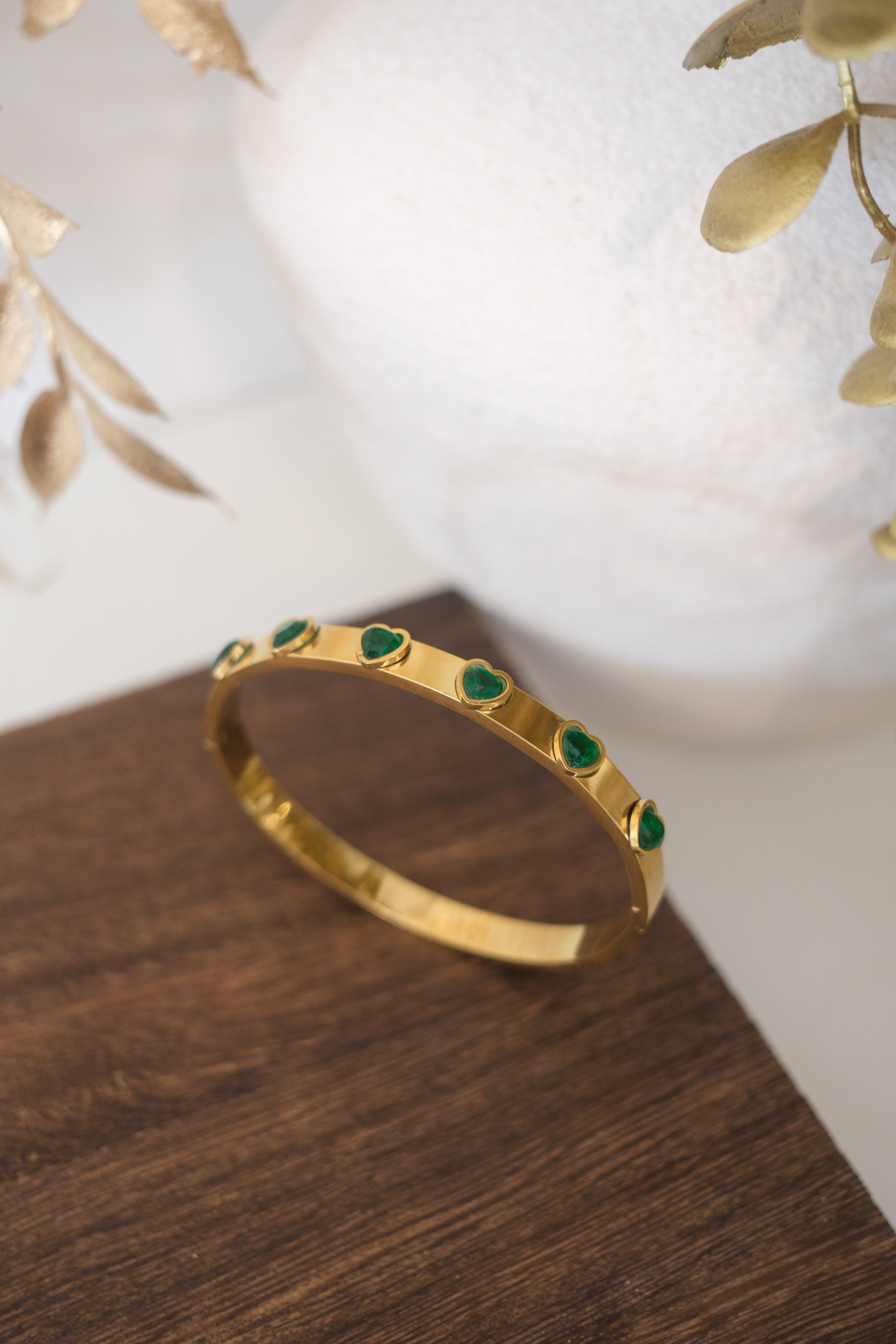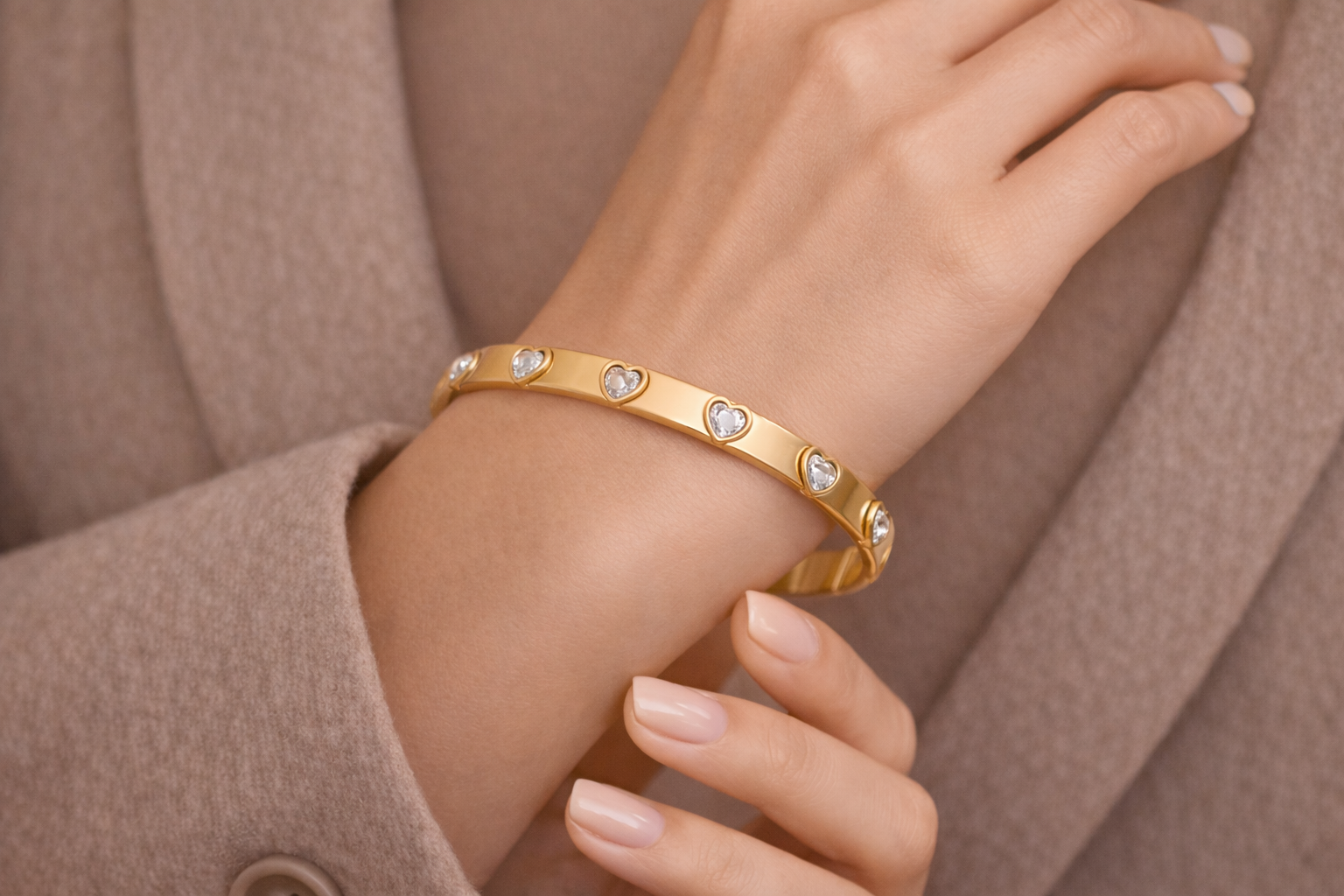 The Cœur d’Or Heart Bangle is a symbol of love expressed with quiet strength and lasting elegance. The repeating heart motif reflects connection and continuity, reminding the wearer that love is not a single gesture, but a series of meaningful moments woven through time. The smooth gold structure symbolizes stability and self-worth, while the heart-shaped stones add softness, emotion, and light.