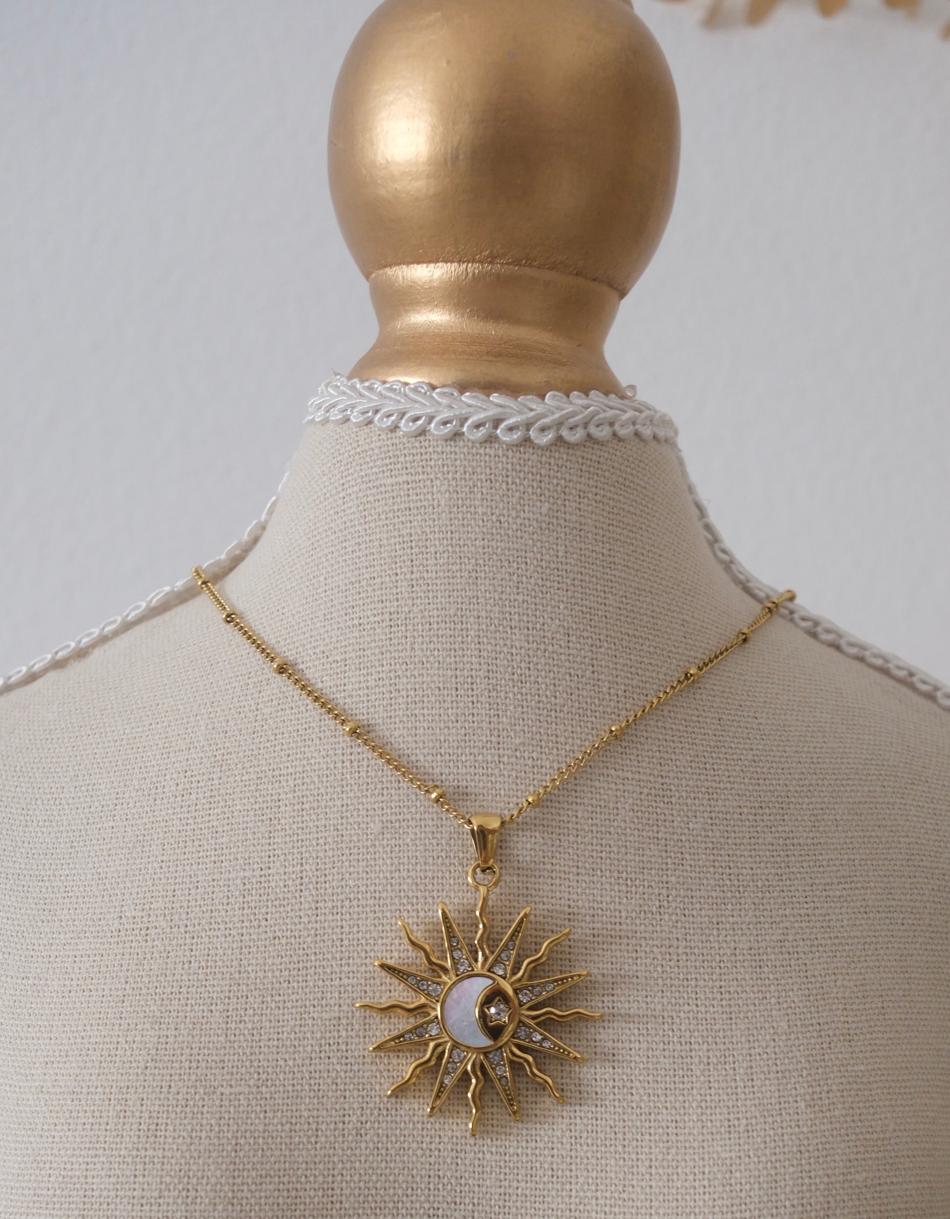 The Elysian Sun Necklace embodies the divine harmony between light and shadow. The eternal dance of the sun and moon. Crafted in radiant gold with a luminous mother-of-pearl moon and crystal stars, it symbolizes balance, wholeness, and celestial energy.