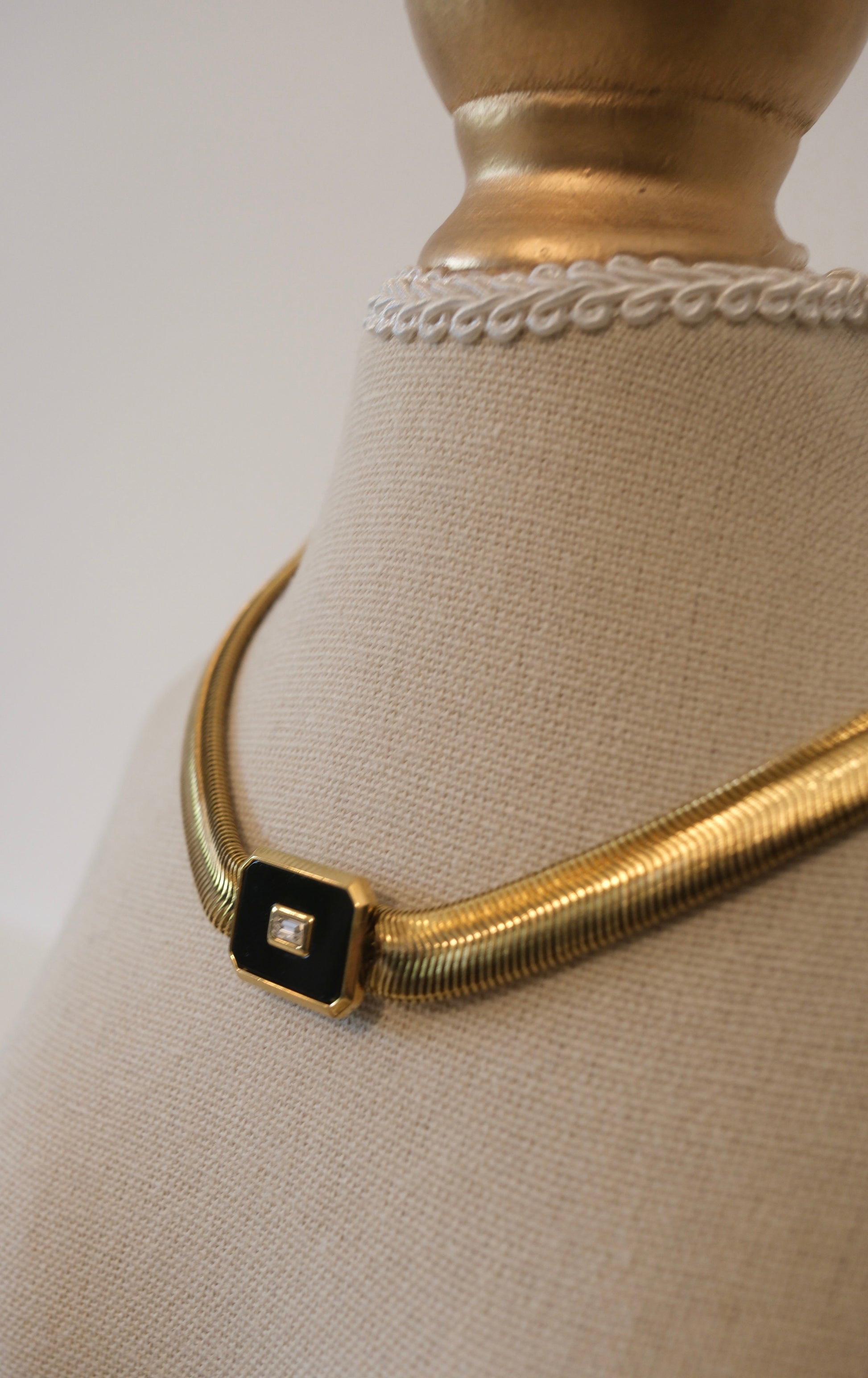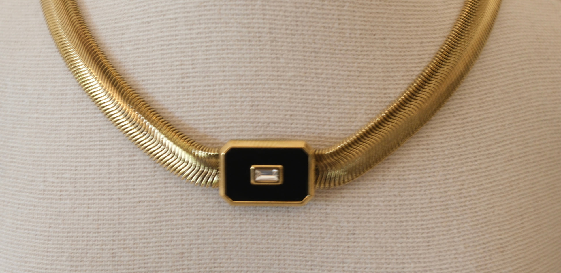 The Obsidian Grace Necklace (Black) is a symbol of elegance, strength, and refined protection. Featuring a sleek black crystal centerpiece set within a structured gold collar, this design channels the grounding power of black obsidian. Known for its ability to absorb negativity, enhance focus, and promote emotional clarity.
