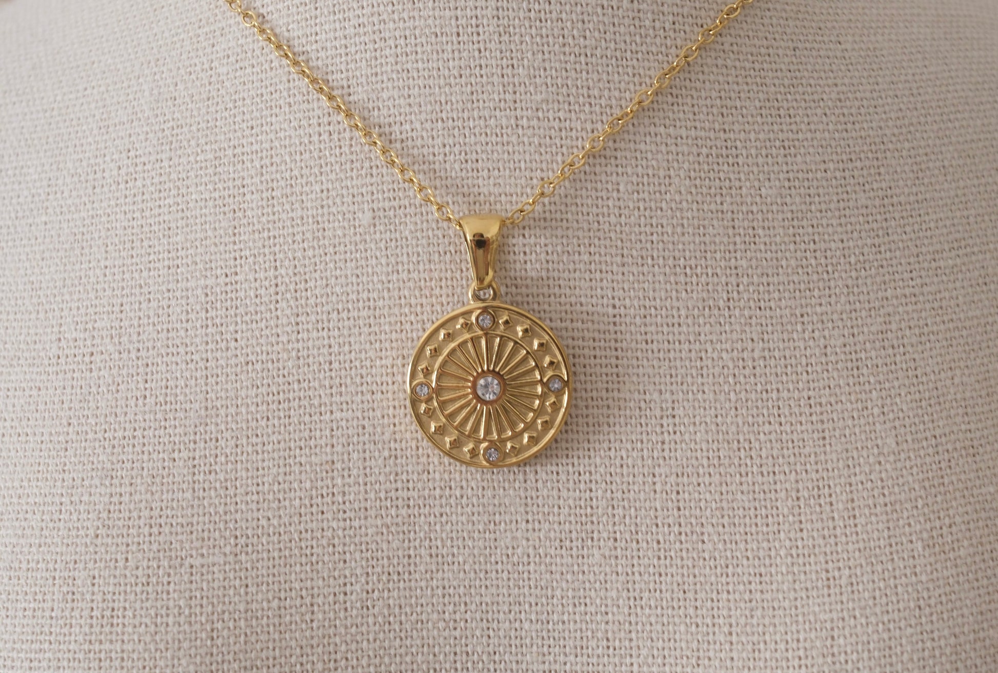 The Helios Medallion Necklace channels the radiant energy of the sun. A symbol of strength, clarity, and divine light in Greek mythology. Its intricate circular design, adorned with luminous crystals, reflects the brilliance of the sun’s rays spreading warmth and power. Each crystal embodies illumination and protection, enhancing inner vitality and confidence.