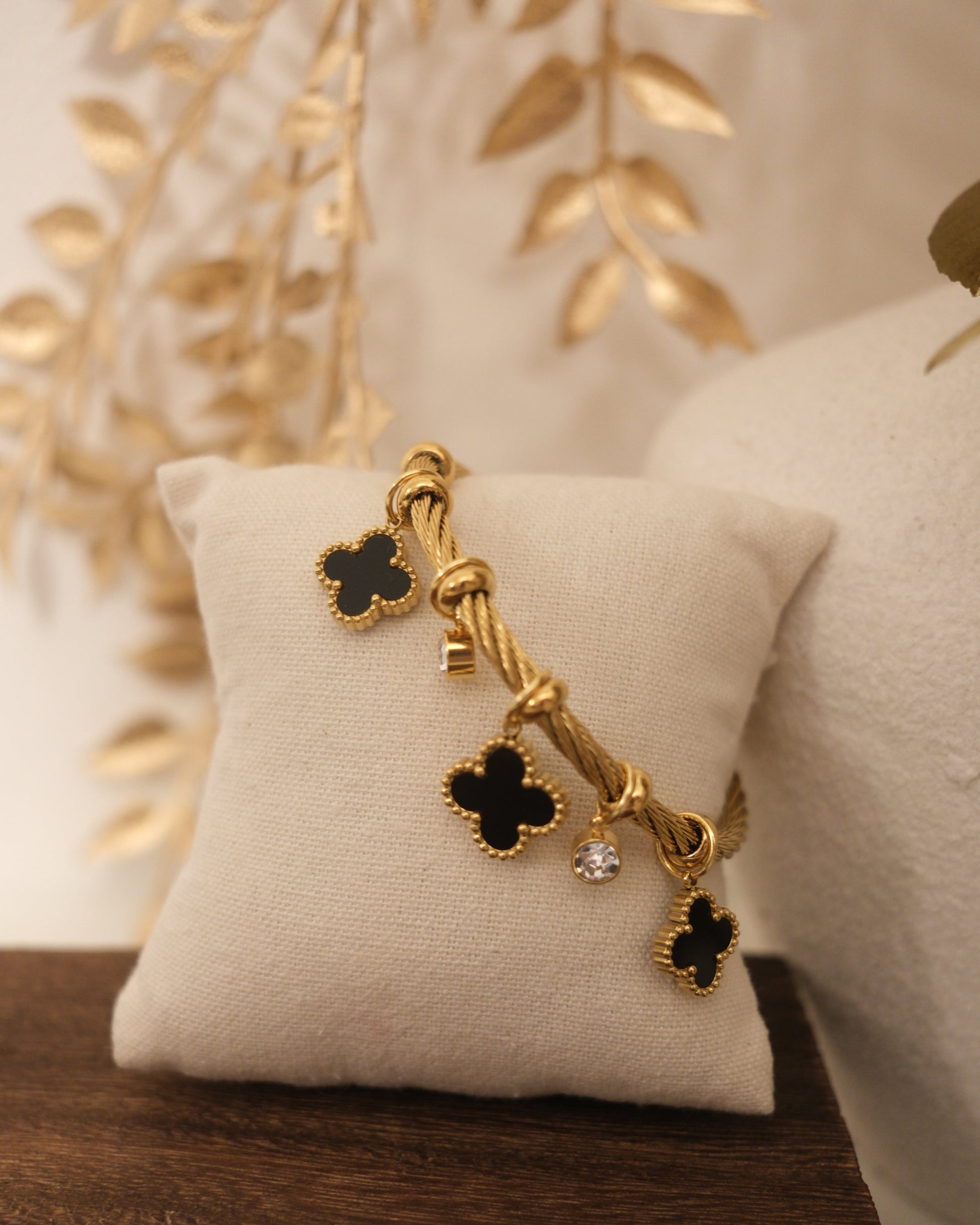 The Lunova Bangle showcases a twisted gold cable silhouette adorned with delicate clover charms and shimmering crystal accents. Soft movement and subtle sparkle bring a graceful rhythm to the design, while the polished gold finish adds a touch of timeless elegance. Feminine yet modern, Lunova is a refined statement piece designed to glow effortlessly from day to night.