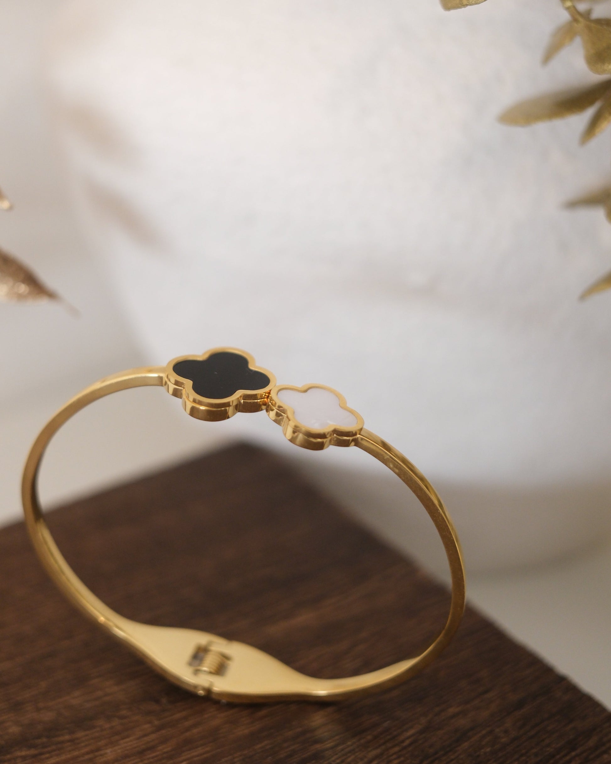 The Lunova Duo Cuff features a refined open design accented with two signature clover motifs, one finished in luminous pearl white and the other in bold oxide black. Set on a sleek gold-tone band, the contrasting stones create a modern balance of light and depth. Elegant yet distinctive.