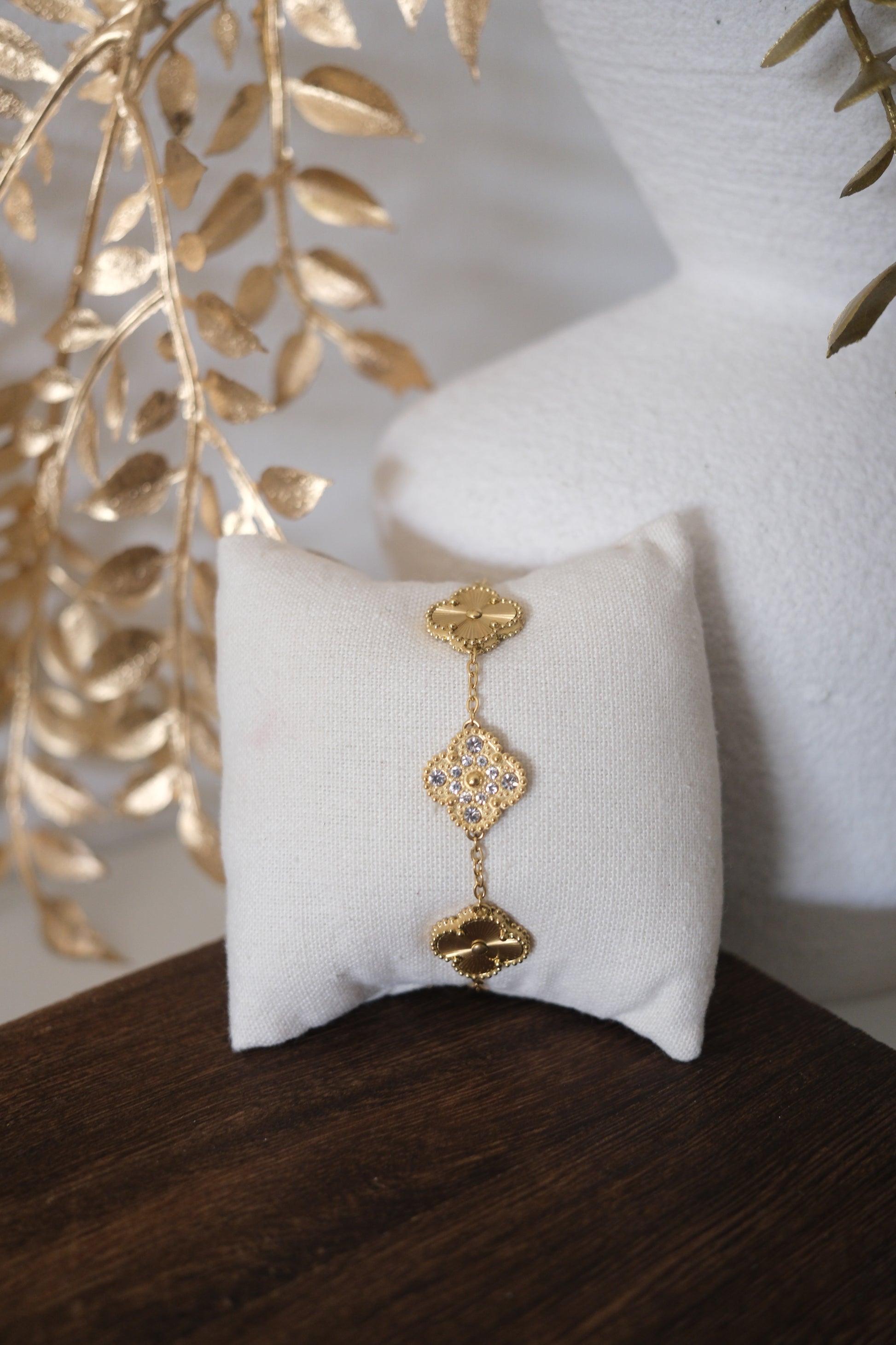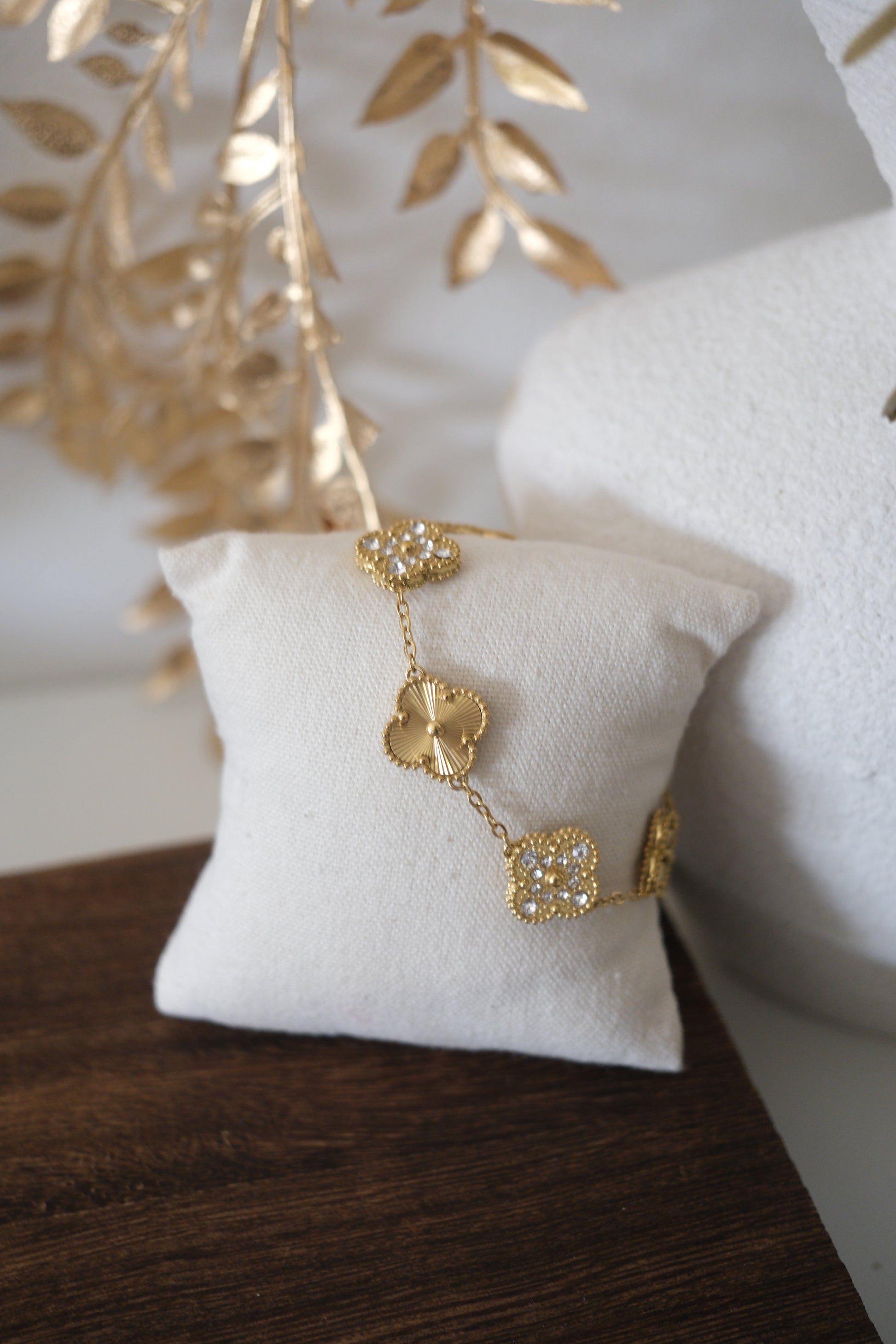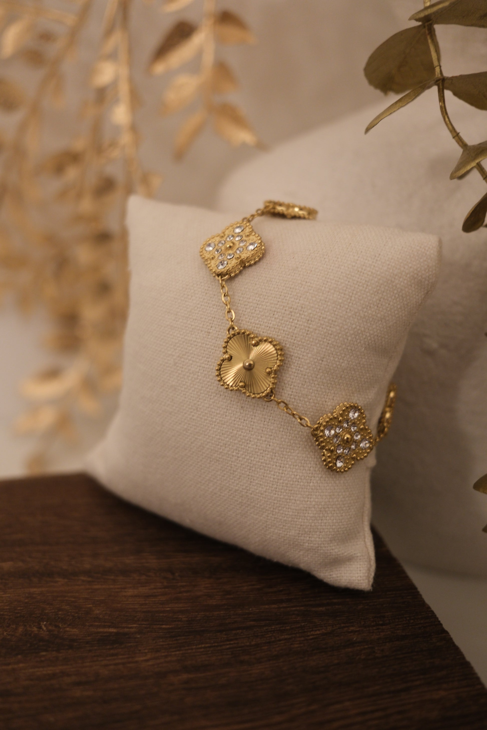 The Lustra Dual Glow Bracelet is a timeless celebration of versatility and refined beauty. It's features double-sided clover charms—one side showcasing a radiant sunburst gold finish, the other adorned with shimmering crystal accents for luminous sparkle. Finished with intricate beaded edging, each charm reflects light gracefully as it moves. Designed to offer two distinct looks in one piece, this bracelet transitions effortlessly from day elegance to evening glamour, making it a meaningful and sophisticated addition to any jewelry collection.