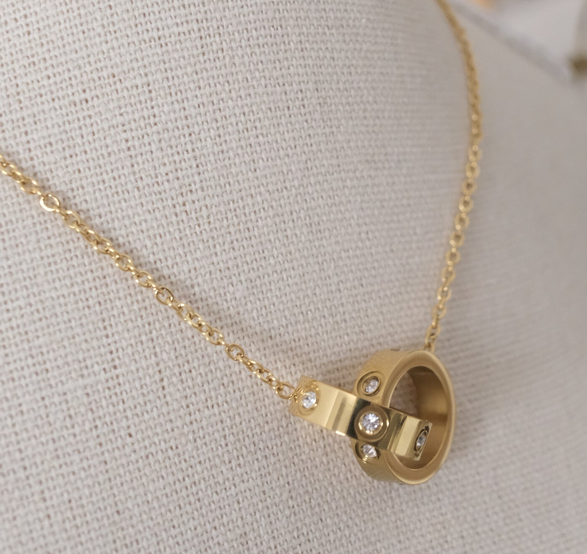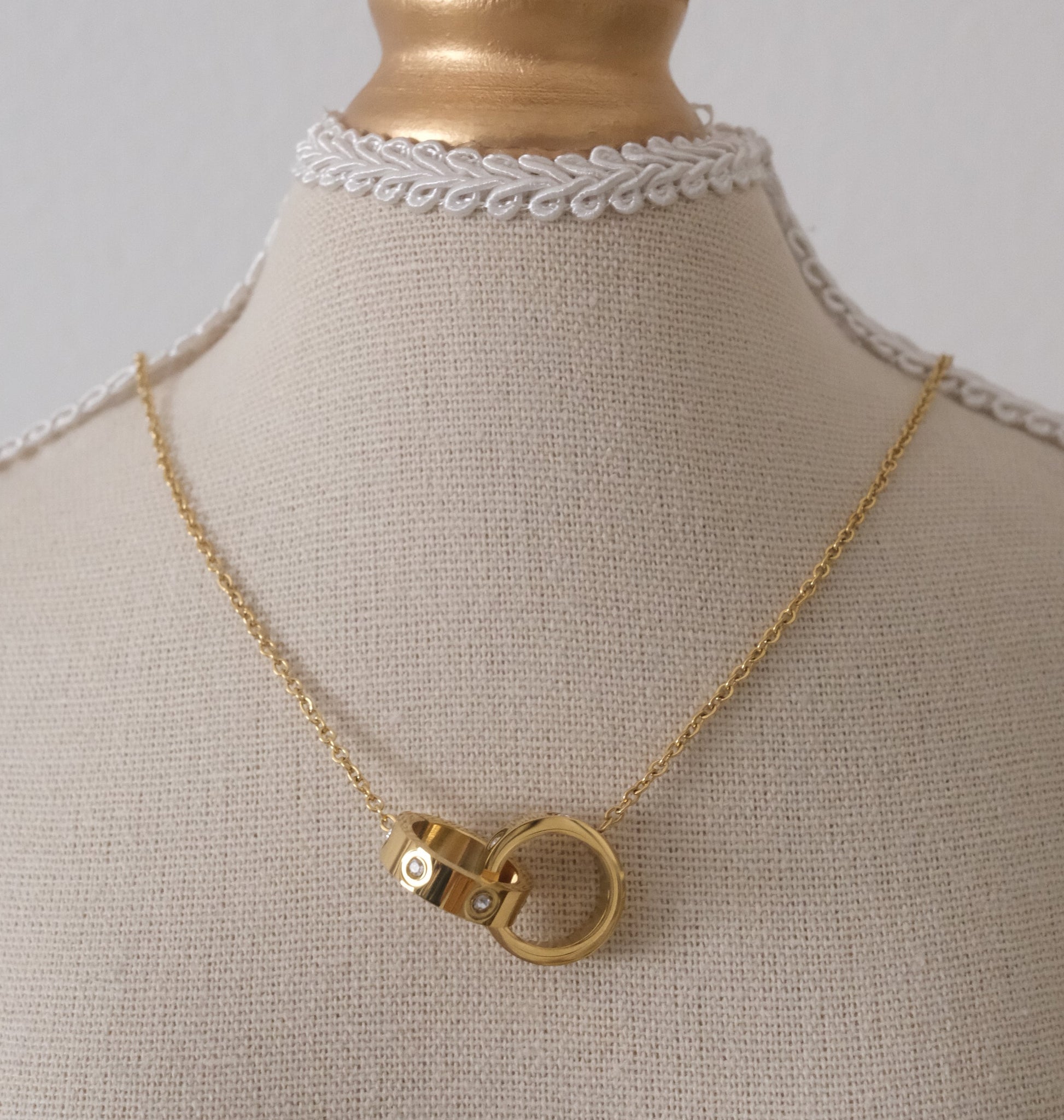 The Radiant Bond Necklace celebrates connection, brilliance, and modern elegance. Featuring two interlocking gold rings adorned with crystals, this design symbolizes unity, harmony, and the beautiful balance between two energies. The rings move gently with every motion, catching the light and creating a captivating sparkle from every angle.