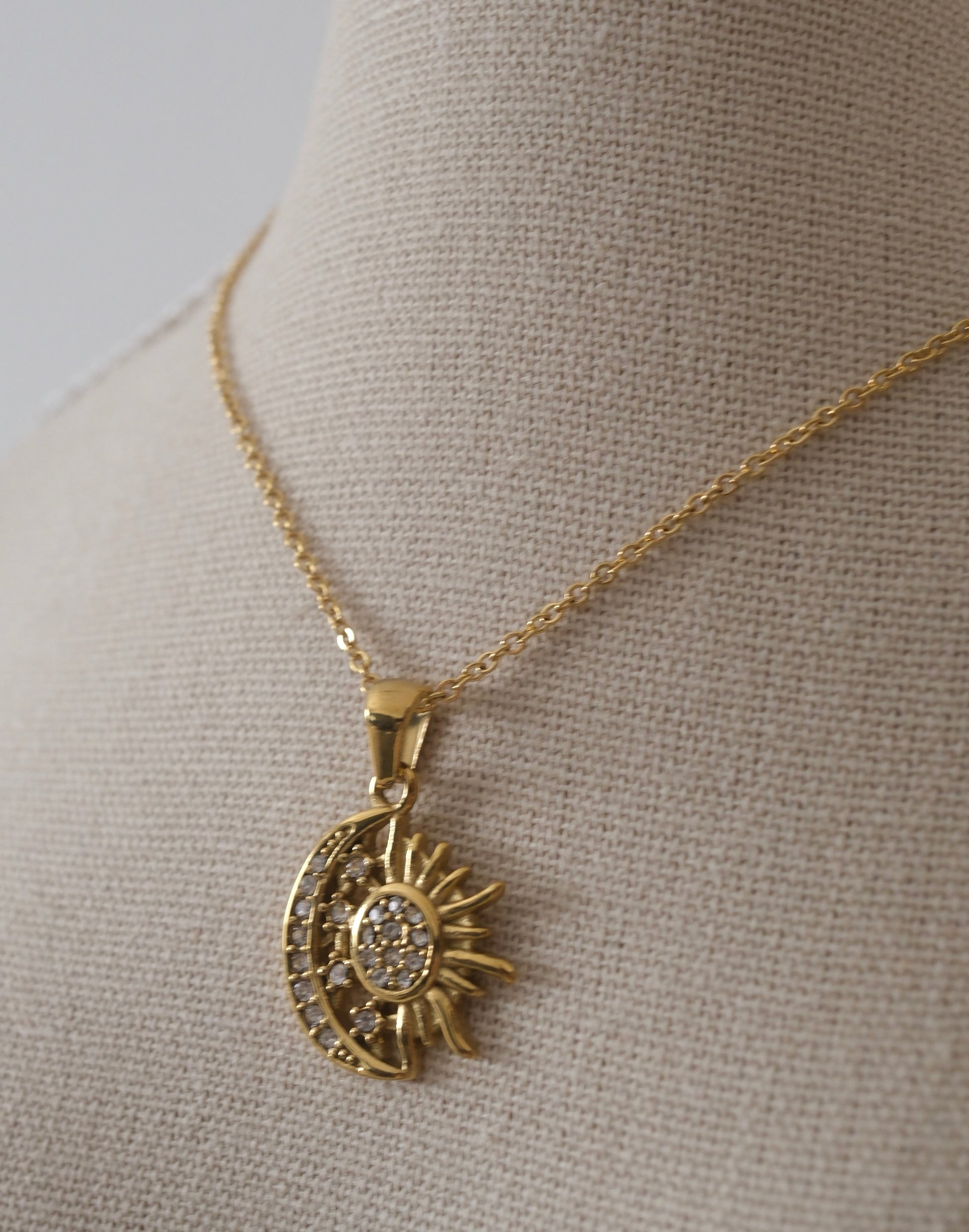 The Soluna Harmony Necklace unites the celestial forces of the sun and moon. A dazzling symbol of balance, transformation, and eternal connection. Crafted in radiant gold and adorned with shimmering crystals, the pendant mirrors the perfect harmony between day and night, light and shadow, energy and calm.