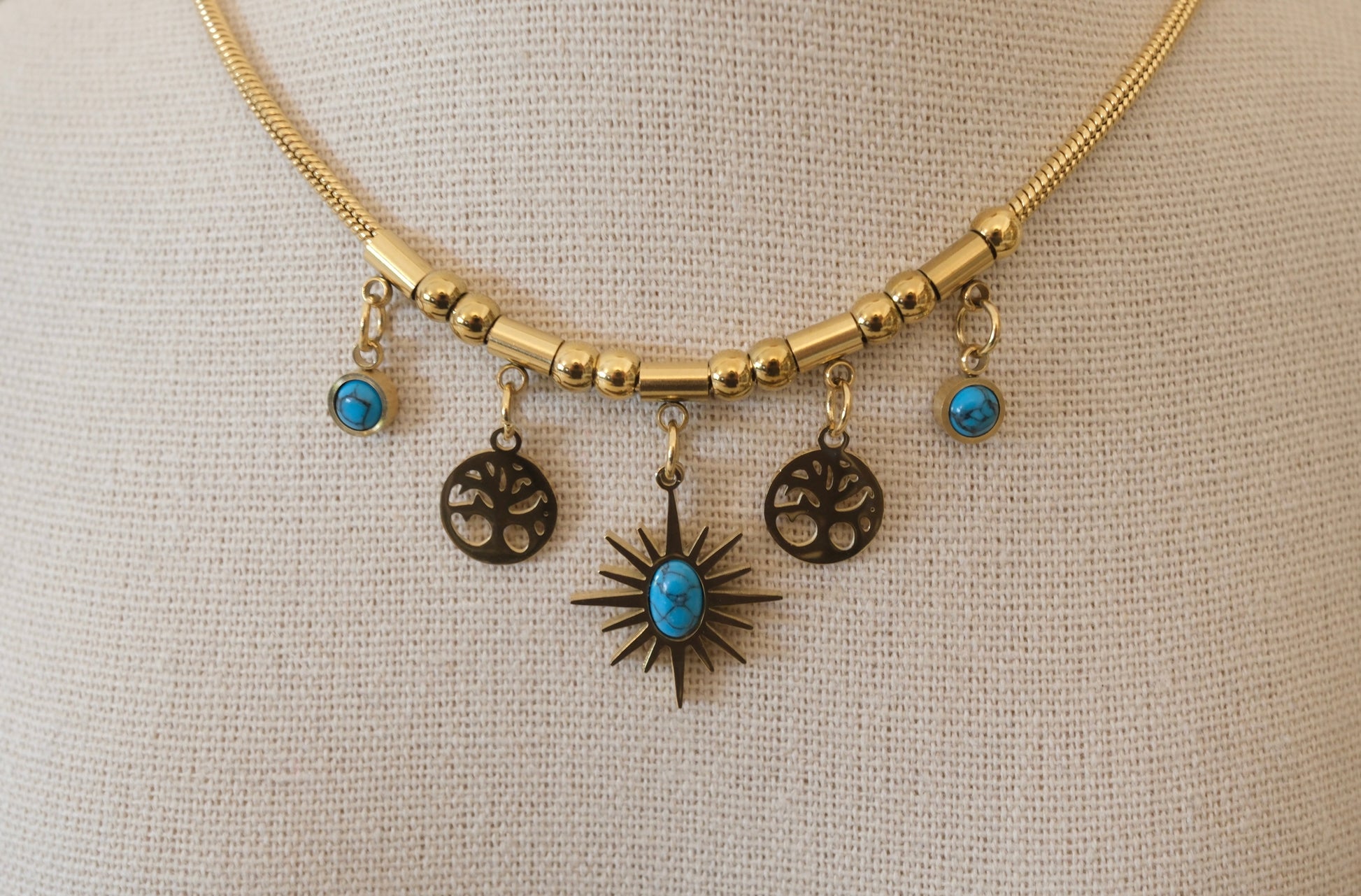 The Celestial Roots Necklace blends the grounding energy of nature with the uplifting spirit of the sky. Adorned with turquoise stones and gold celestial charms, this piece embodies harmony, wisdom, and protection. Turquoise, known as the stone of tranquility and truth, connects the mind and heart. The tree of life motifs symbolize growth and grounding, while the radiant sun charm reflects renewal and inner light.