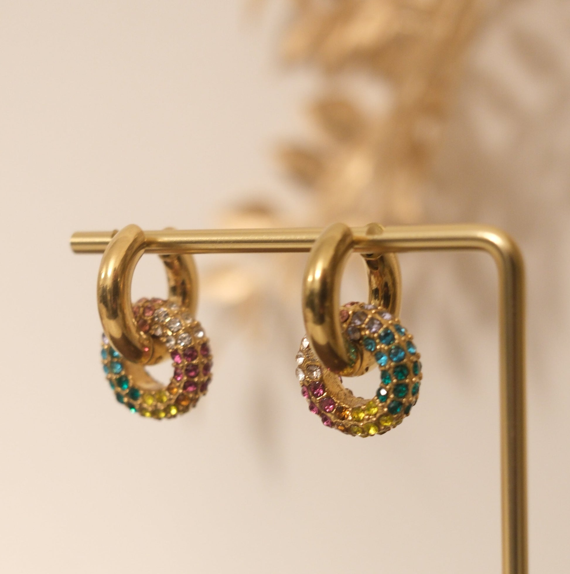 The Chroma Aura Hoops celebrate joy, balance, and self expression. Encircled with multicolored crystals, each hue represents a different energy, love, clarity, creativity, vitality, and harmony, coming together in a radiant circle. Features