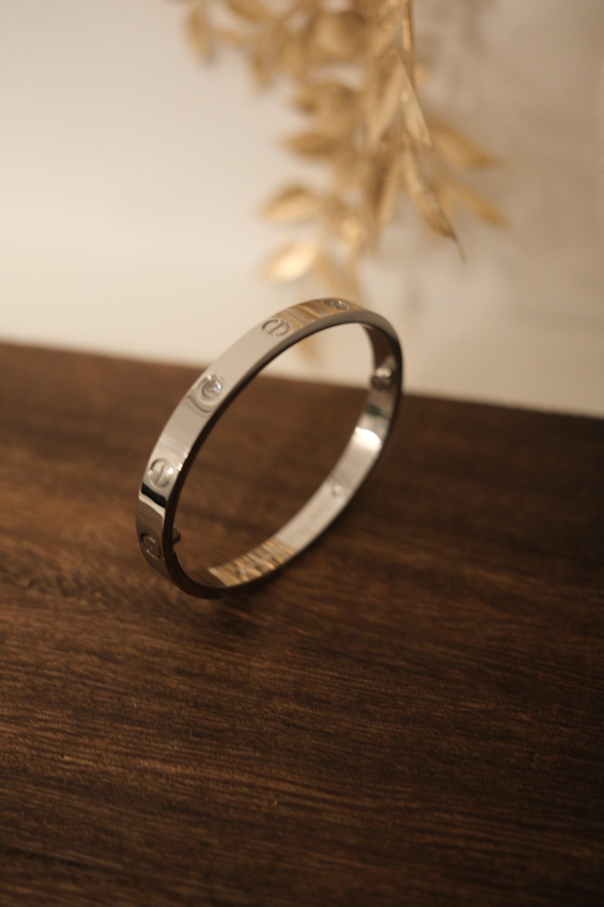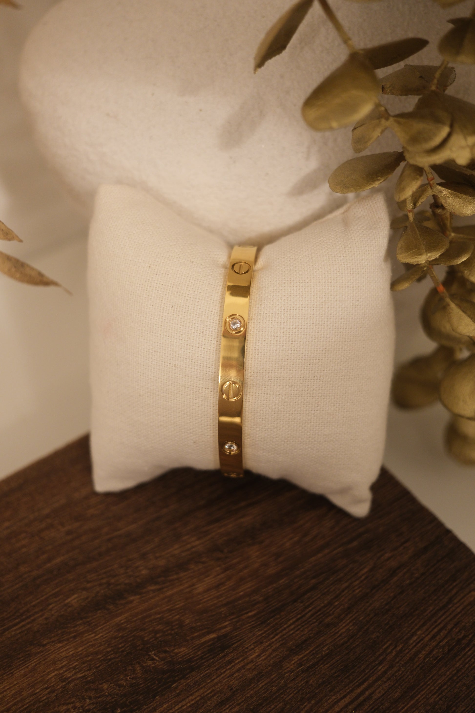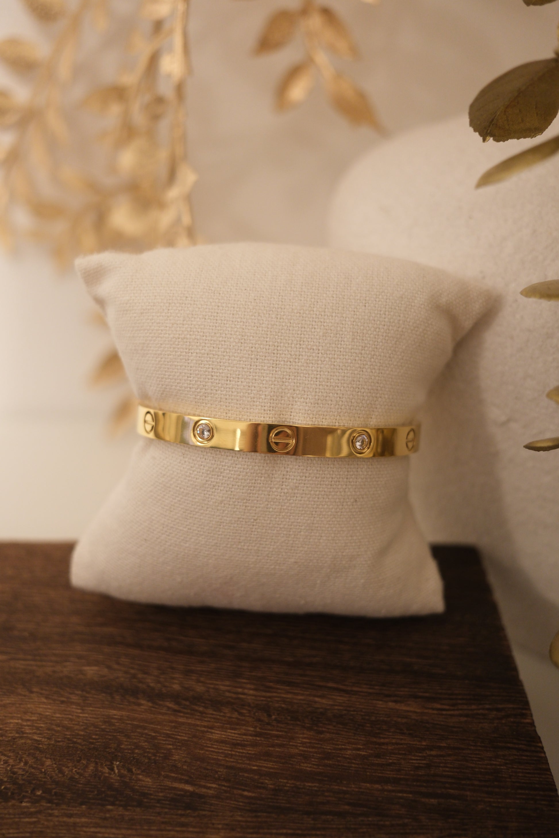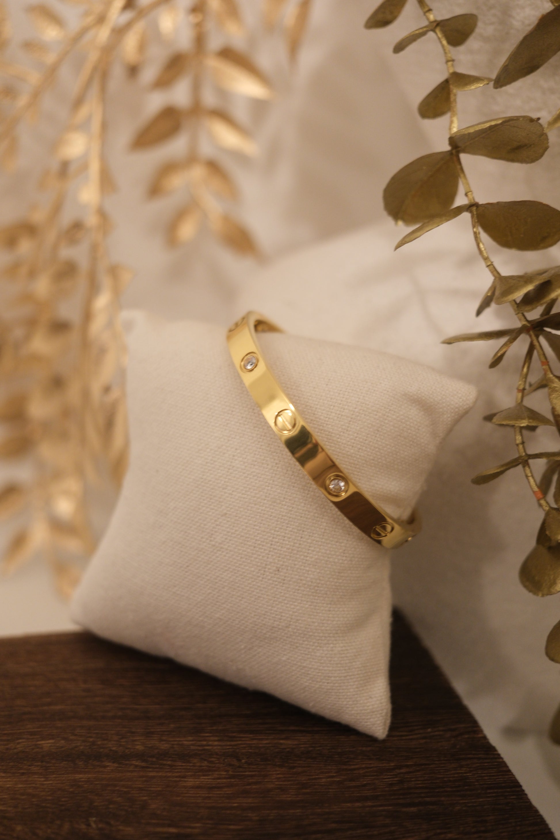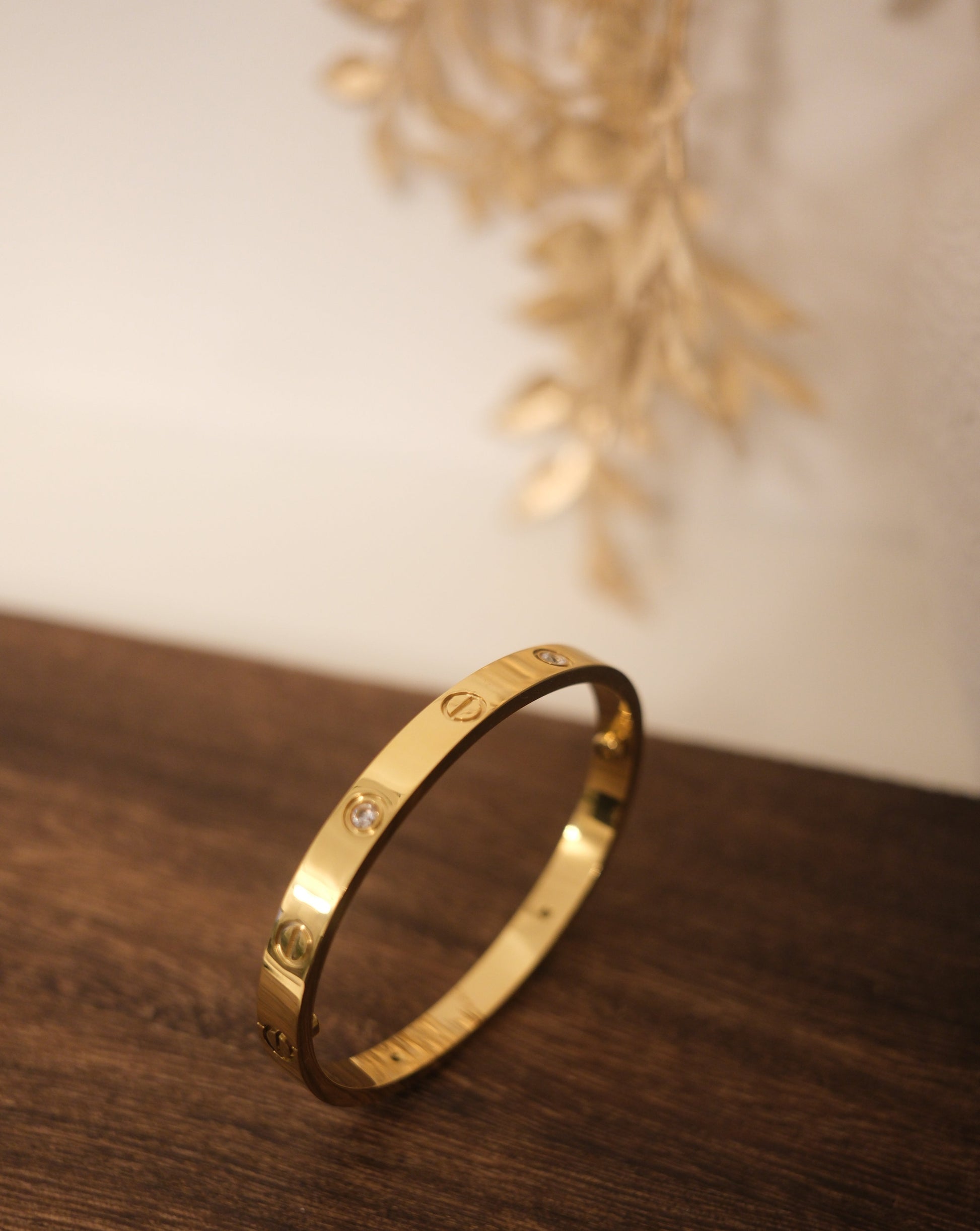 The Vyxen Lumi Bangle elevates the signature Vyxen design with delicate crystal accents set between sleek screw-in motifs. Crafted in polished gold, its refined silhouette is enhanced by subtle sparkle that catches the light with every movement. Bold yet feminine, this bangle blends modern edge with a touch of glamour—perfect for those who love statement elegance with a luminous finish.