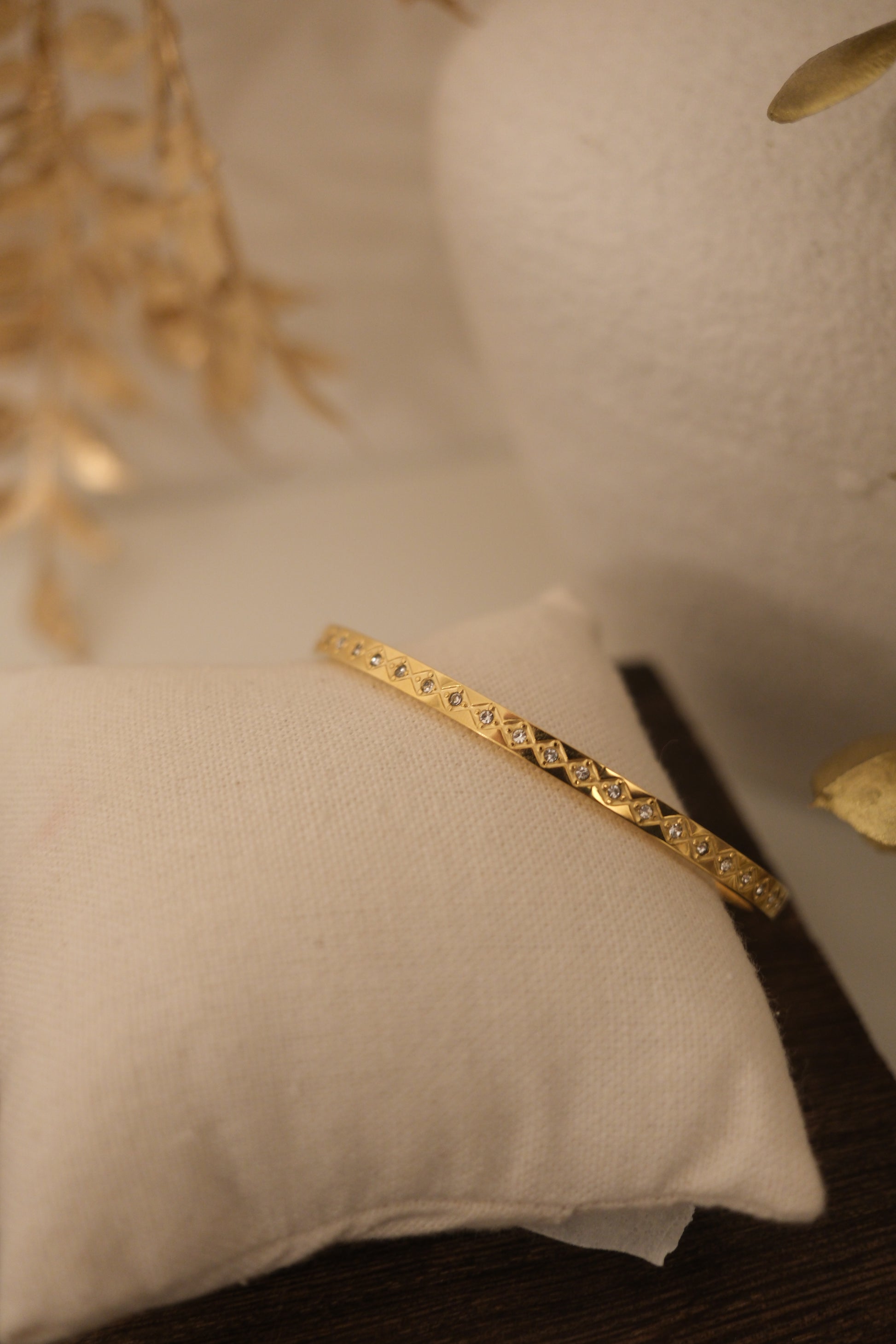 The Ziva Chevron Bangle features a sleek gold silhouette accented with a delicate zigzag pattern and shimmering crystal details. Designed to catch the light with every movement, this bangle blends geometric precision with timeless elegance. Perfect for everyday sophistication or effortless stacking, it adds a subtle sparkle to any look.